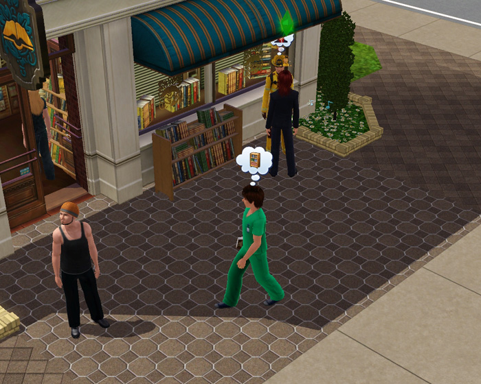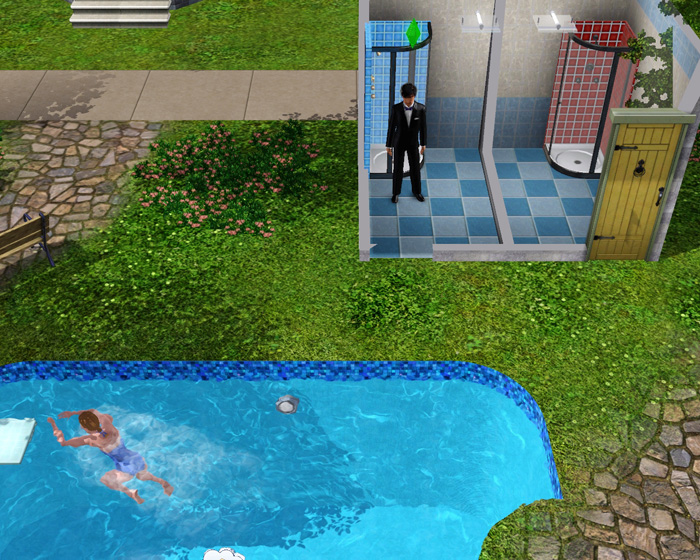 この仕組みを利用して、仕事着で通りかかったシムがプールに入ると→水着→プールから出ると着替えイベントが発動してデフォルトの普段着に戻るハズなのです…。